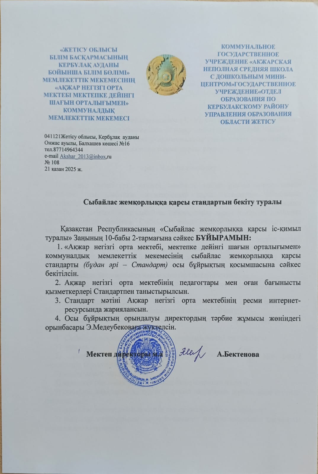 Cыбайлас жемқорлыққа қарсы стандартын бекіту туралы » Жетісу облысы Кербұлақ ауданы Ақжар орта мектебі